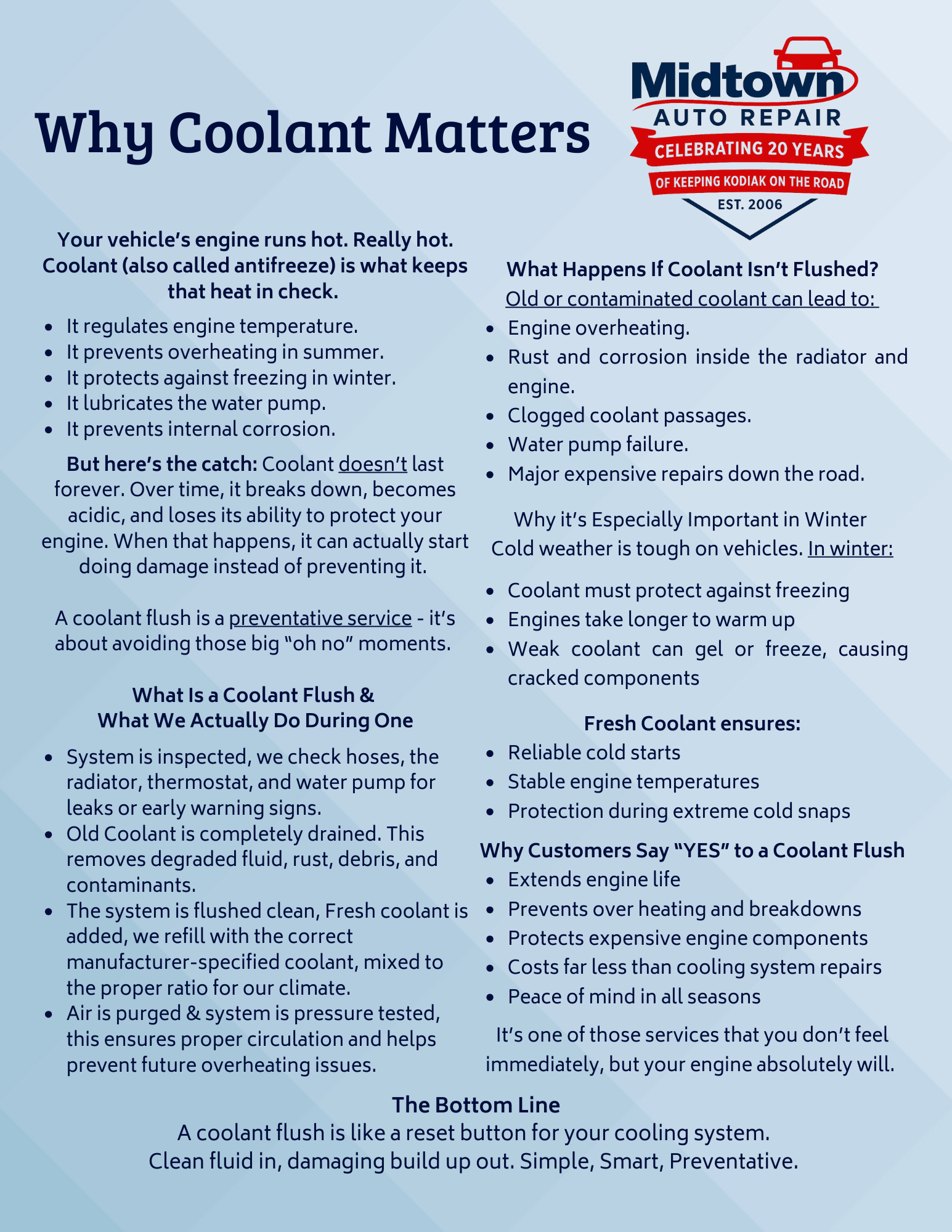 Context – “Back in January we ran a little winter helper, Coolant is basically your engine’s “don’t overheat and ruin my day” protection. Over time it wears out, and fresh coolant helps keep things running steady, whether you’re commuting, hauling, road tripping, or just trying to make it through the season without surprises.